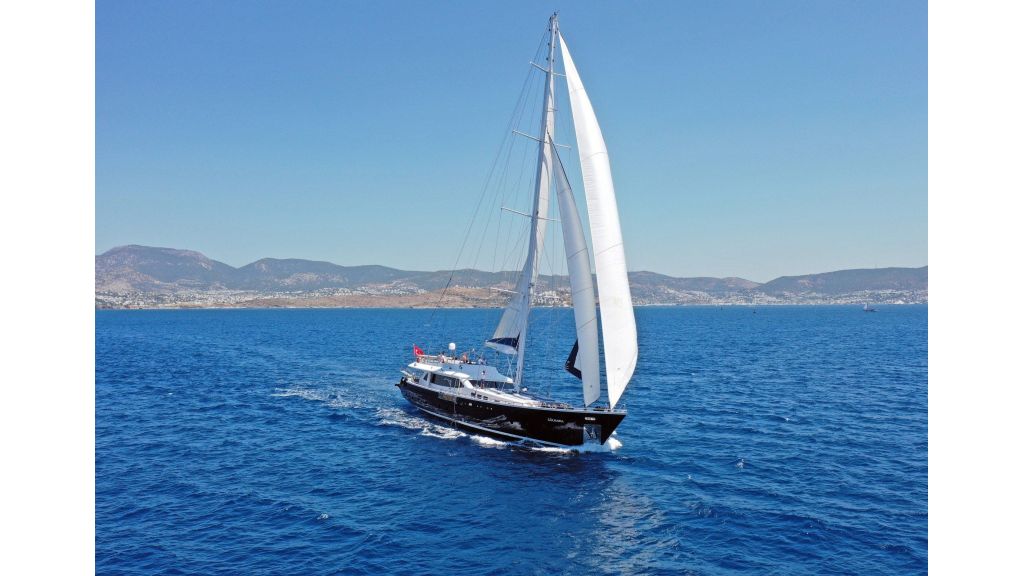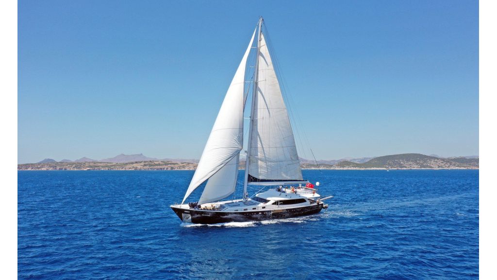 Canaria (ex Gulmaria) is a refined luxury gulet built in Bodrum, available for private charter with Southern Cross Blue Cruising, showcasing modern Turkish craftsmanship and bright, elegant interiors throughout. Designed to accommodate up to 12 guests in 6 luxurious cabins, including a master suite, one VIP cabin, and double cabins, the yacht delivers exceptional comfort supported by a highly experienced 6-member professional crew providing first-class service. Guests can relax in the stylish indoor lounge with comfortable seating, TV, and dining area, or enjoy the spacious flybridge, ideal for sunbathing, socializing, and unwinding while cruising the Aegean and Mediterranean waters. With Wi-Fi available in Turkish waters, Canaria is an outstanding choice for a luxury gulet charter in Bodrum, offering an elegant and relaxing sailing experience along the Turkish coast.